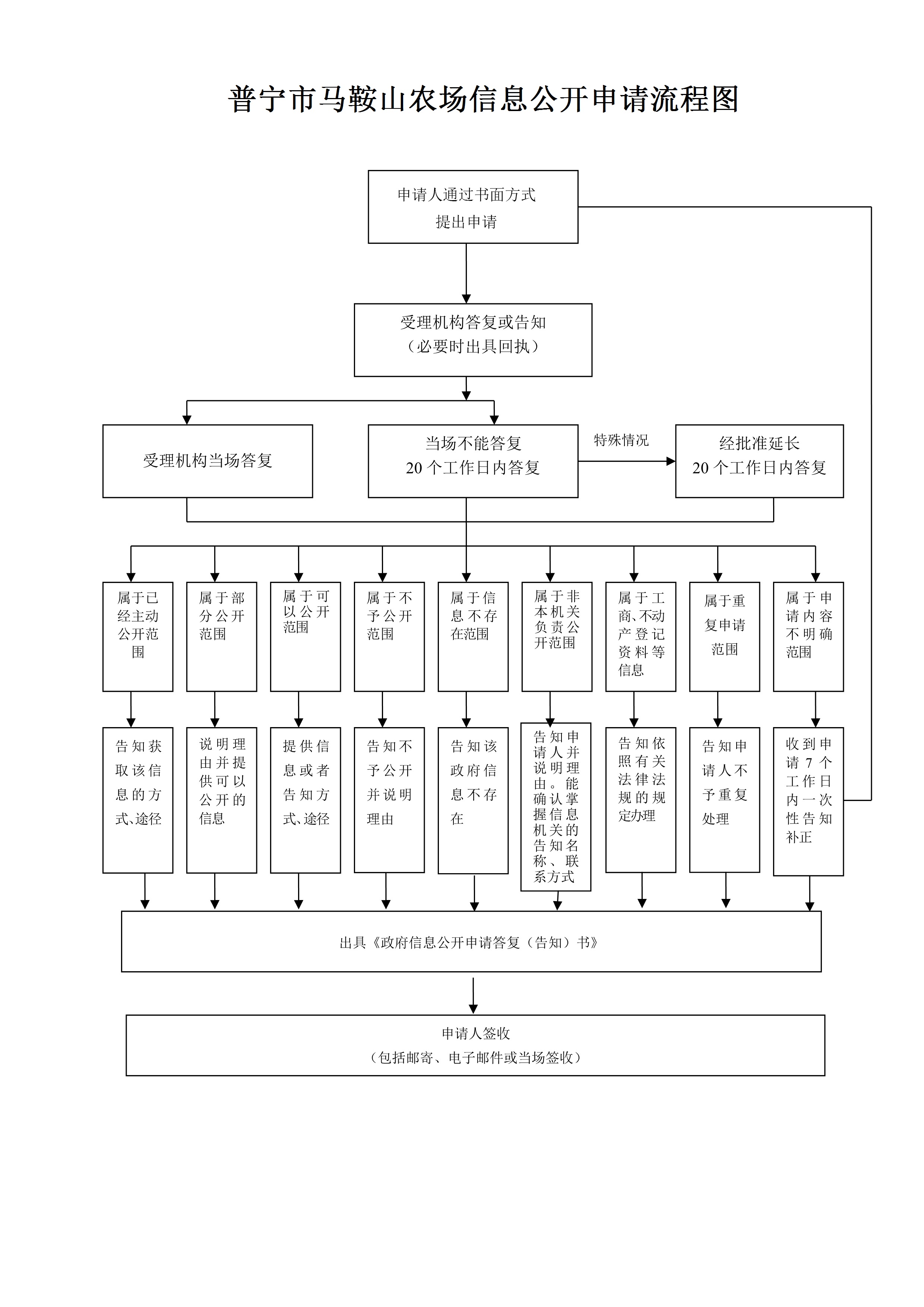 对于能够当场答复的政府信息公开申请,将当场答复;不能当场答复的,自申请之日起20个工作日内予以答复;确需延长答复期限的,经大坪农场办公室政府信息公开工作机构负责人同意,延长答复时间不超过20个工作日,并告知申请人。本机关征求第三方和其他机关意见所需时间不计算在前款规定的期限内。