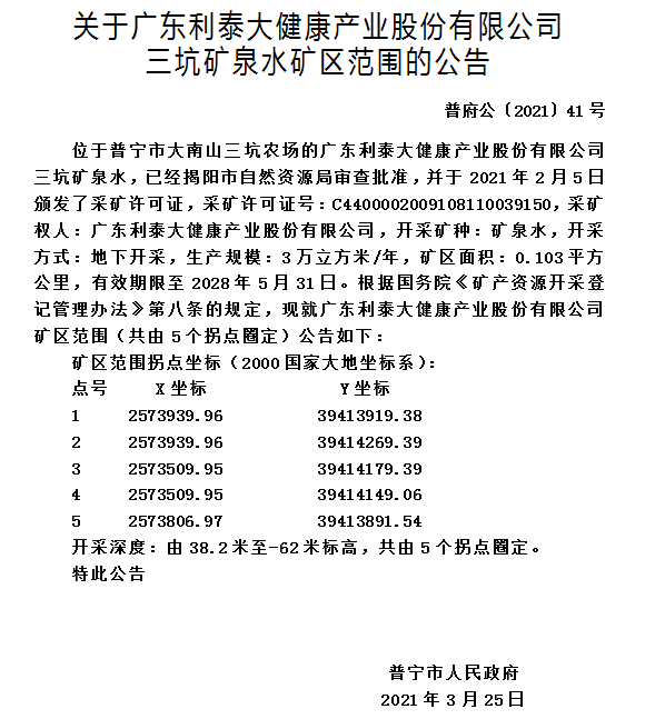 关于广东利泰大健康产业股份有限公司三坑矿泉水矿区范围的公告 - 可乐直播 政府门户网站