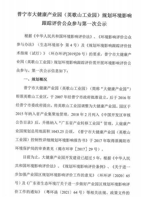 可乐直播 大健康产业园(英歌山工业园)规划环境影响跟踪评价公众参与第一次公示 - 可乐直播 政府门户网站