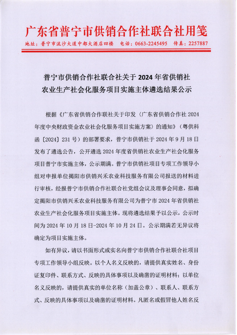可乐直播 供销合作社联合社关于2024年省供销社农业生产社会化服务项目实施主体遴选结果公示