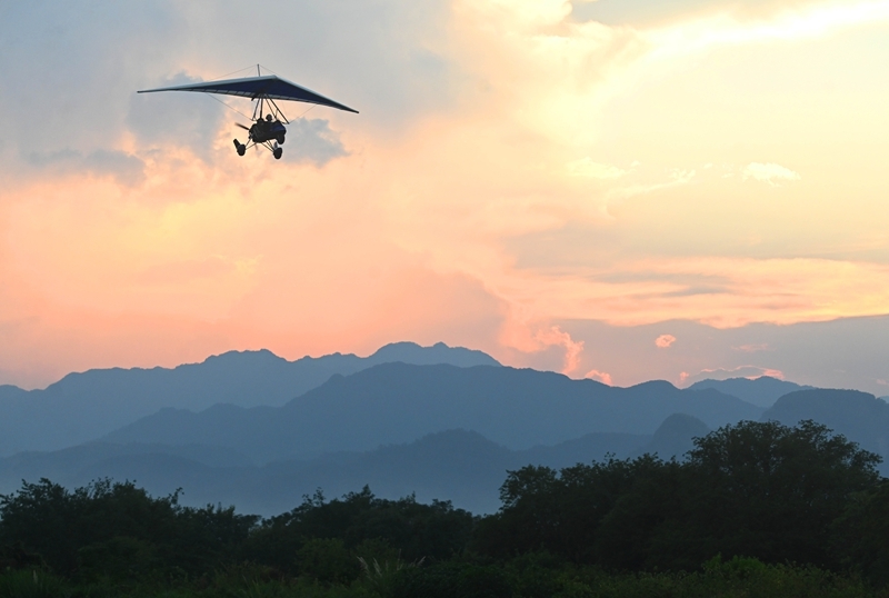 10月6日,游客在浙江省金华市武义县大斗山飞行营地乘坐动力三角翼。新华社发(张建成 摄)