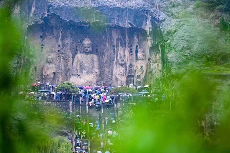 10月1日,游客冒雨游览位于河南洛阳的龙门石窟。新华社发(李卫超 摄)