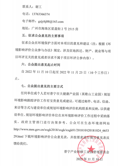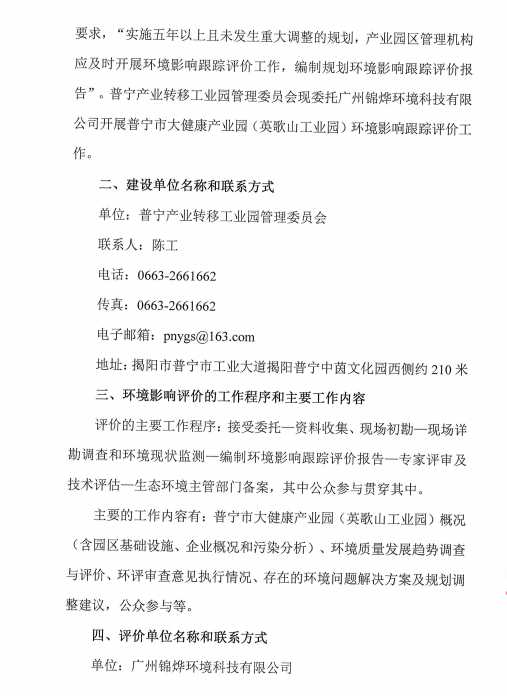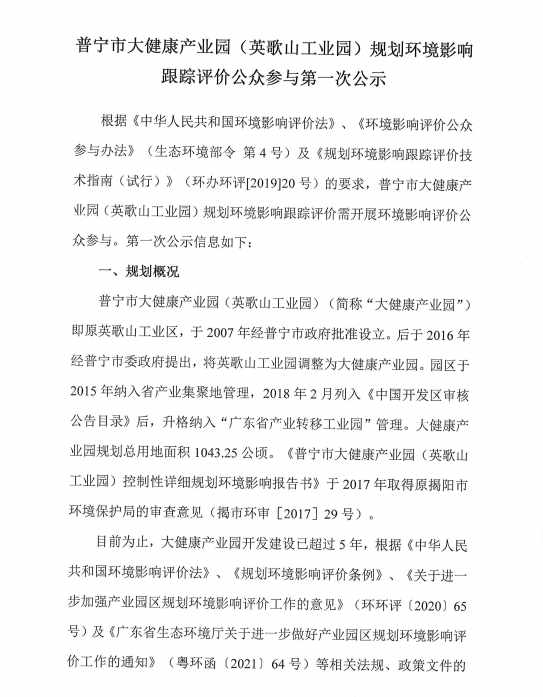 可乐直播 大健康产业园(英歌山工业园)规划环境影响跟踪评价公众参与第一次公示