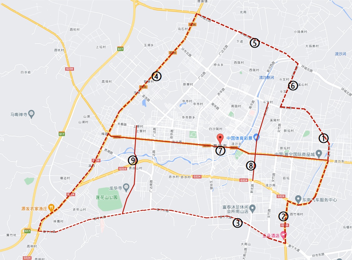 图例说明:1、上图红色实线为全天24小时禁行道路:⑦为流沙大道,⑧为新光路,⑨为大学路。2、上图红色虚线为禁限行区域边沿道路,①东环大道,②为康美大道,③为普宁大道,④为普益大道,⑤为北二环大道,⑥为文竹路。