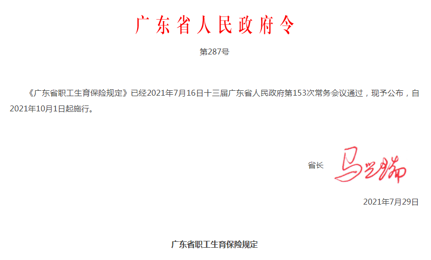 第三十七条本规定自2021年10月1日起施行。广东省人民政府2014年11月6日公布的《广东省职工生育保险规定》(省人民政府令第203号)同时废止。